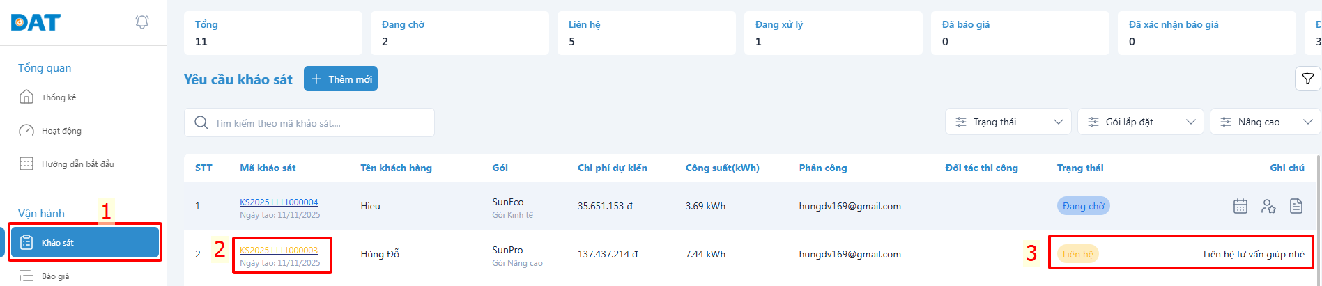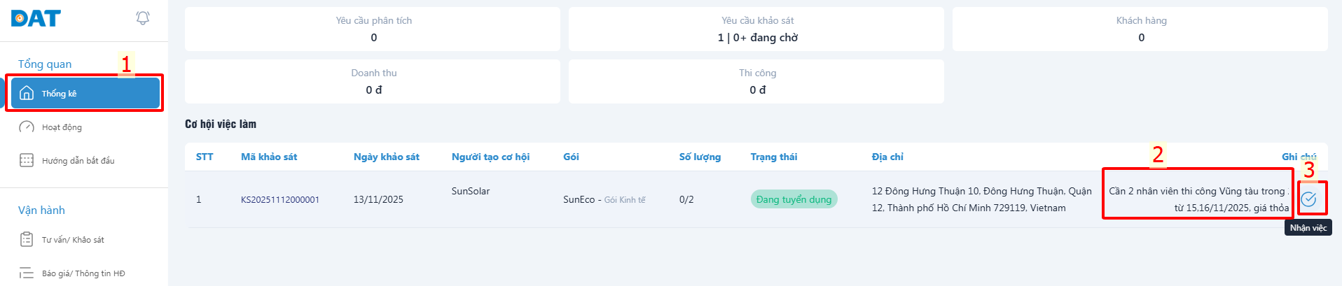 Bước 4: Nhận yêu cầu khảo sát & thi công từ DAT