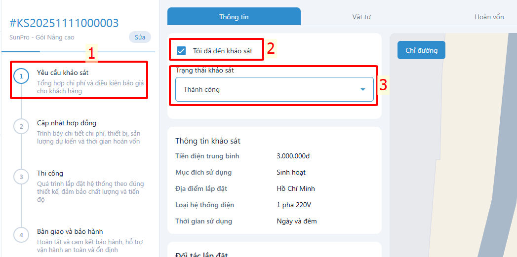- Mã khảo sát & thời gian khảo sát: Bạn cần thực hiện khảo sát đúng thời gian đã hẹn với khách hàng (Click vào mã khảo sát để xem chi tiết hơn)